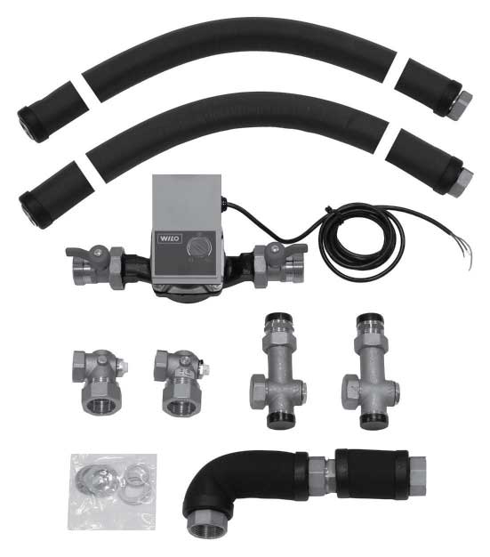 Состоит из двух гибких кислородоупорных труб по 1,5 м из нержавеющей стали в теплоизоляции, насоса, сервисных кранов насоса, обратного клапана и фитингов. Используется для комбинации «котёл-бойлер» снизу или справа. Для мощности котла до 32 кВт и бойлера до 150 л также возможна установка бойлера слева.